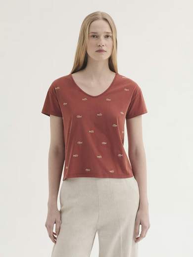 Maglietta ricamata con motivo di pesci. Scollo a V e manica corta scesa. Made in Portugal.
