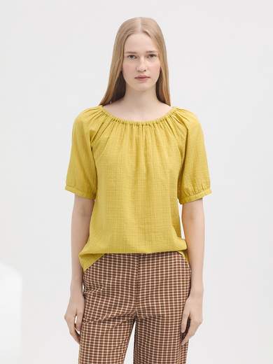 Blusa in maglia di cotone sostenibile. Scollo a barchetta con elastico a scomparsa.