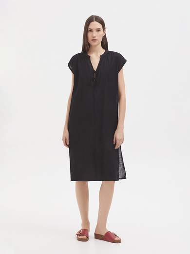 Abito a tunica in cotone sostenibile. Collo alla coreana con apertura e lacci. Maniche ad aletta. Spacchi laterali al fondo