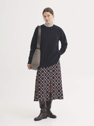 Gonna in crêpe di viscosa con stampa Checkered. Elastico interno nel cinturino e laccetti dello stesso tessuto. Spacco sul davanti. Taglio svasato.