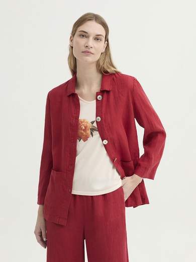 Giacca realizzata in tessuto 100% lino fil à fil. Presenta collo a camicia e abbottonatura in madreperla. Include cuciture e tasche frontali, fianchetti e piccoli spacchi sul retro.