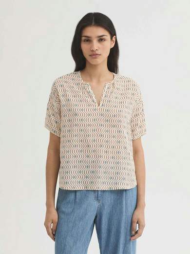 Top tessuto quadrettato con stampa Hellenic Waves. Scollo tondo con apertura con profili, manica corta ed elastico interno nel polso.