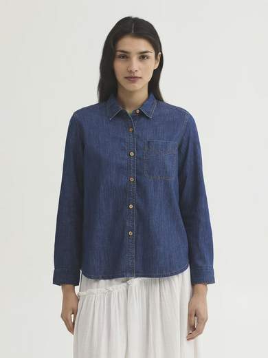 Camicia in denim di cotone sostenibile, con colletto camicia, abbottonatura in cocco, tasca applicata, carré con cinturino e bottone sul retro e manica lunga con apertura, polsino e bottone.