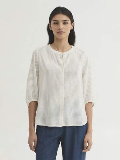 Blusa in tessuto misto cotone sostenibile a righe, con collo alla coreana, abbottonatura frontale, manica a sbuffo con profilo sul fondo, carré e arricciatura sul retro.