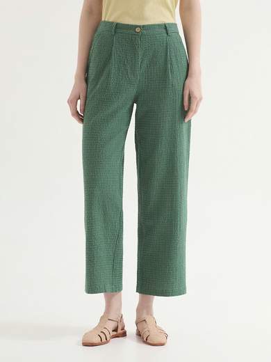 Pantaloni con pinces realizzati in tessuto seersucker mini vichy. Chiusura sul davanti con zip e bottone in cocco. Cinturino con passanti ed elastico interno sul retro. Gamba dritta.
