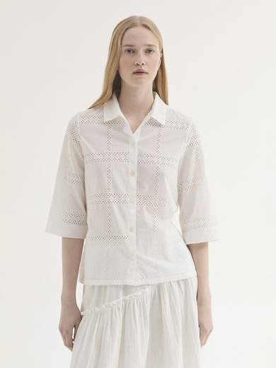 Camicia in tessuto ricamato svizzero di cotone sostenibile, con colletto camicia, abbottonatura frontale e manica a mezzo braccio.