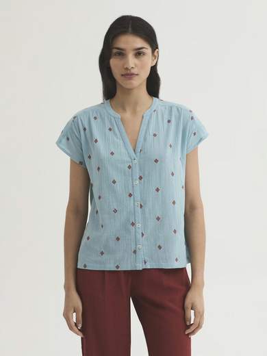 Camicia in tessuto Diamond ricamato di cotone sostenibile, con collo alla coreana e apertura, abbottonatura frontale e manica corta senza giromanica.