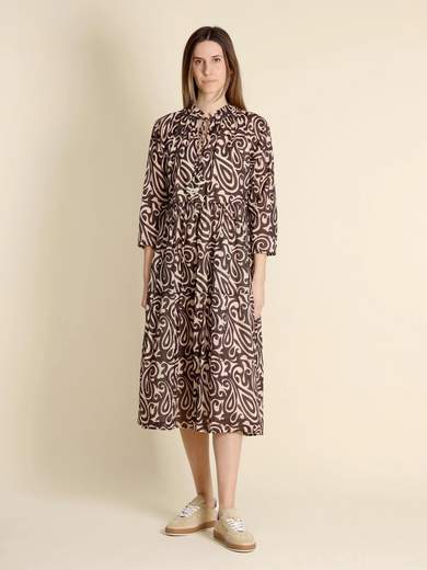 Abito lungo e ampio a balze fantasia, manica tre quarti, con laccetti sulla scollatura a formare un fiocchetto