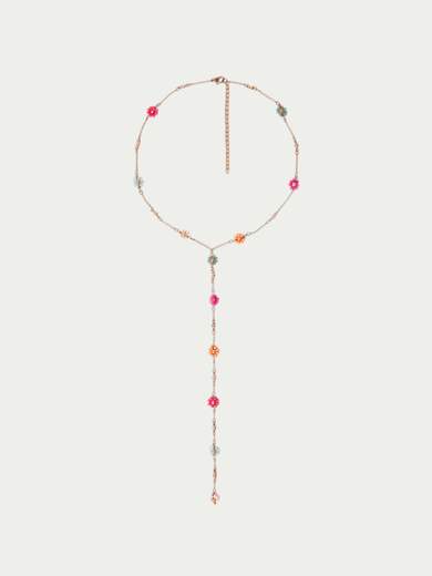 Collana color oro rosa con fiori pendenti multicolori. Finiture dorate. Chiusura a moschettone.