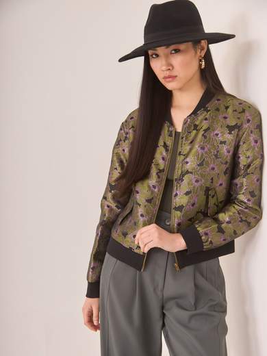 Bomber con stampa jacquard metallizzata bicolore. Collo, polsini e orlo elasticizzati in colore a contrasto. Tasche laterali con patta. Chiusura con zip e finiture dorate.