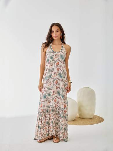 Abito lungo con stampa floreale multicolore. Manico a cappola con scollo a V che si annoda al collo. Apri la schiena con arricciamento elastico.