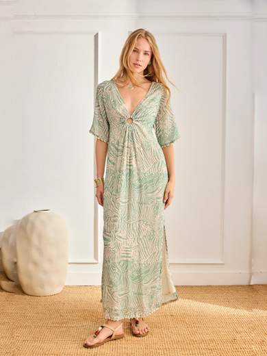 Abito lungo con scollo a V e taglio ad anello centrale. Le maniche a tre quarti sono rifinite con rifiniture a forma d'onda. La schiena presenta arricciamenti elastici e un ritaglio aperto con un nodo al collo. Dettaglio a fessura laterale.