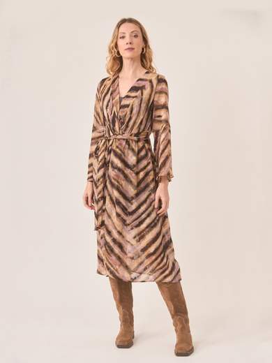 Abito midi avvolgente con stampa animalier. Maniche lunghe con polsini aperti. Laccio in vita.