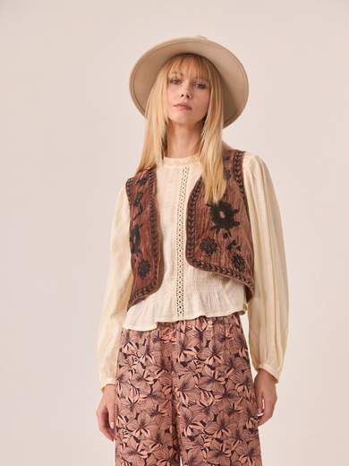 Gilet in velluto con motivi floreali ricamati a contrasto. Tessuto effetto stropicciato.