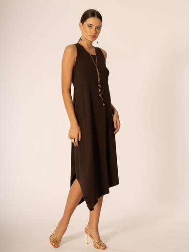 Abito asimmetrico con collana.
