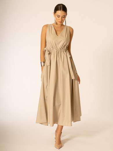 Abito con scollo a V. Fiocchi laterali in vita.