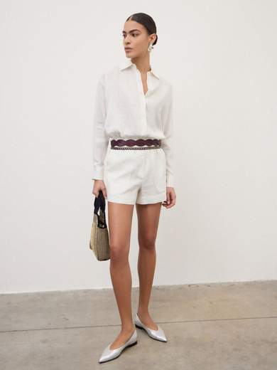Camicia over realizzata in lino con base bianca tramata e filato lurex argento, che dona al capo un delicato effetto luminoso. La linea ampia e rilassata è pensata per offrire comfort e leggerezza, mantenendo un’eleganza naturale. Perfetta da indossare sia come capo principale che aperta, per look estivi freschi e raffinati.