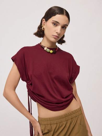T-shirt cropped con coulisse laterali, che aggiungono movimento alla linea. Un capo moderno e leggero, ideale per look estivi da abbinare a pantaloni o gonne a vita alta.