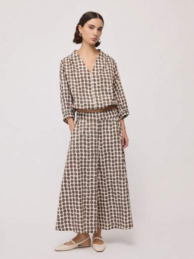 Pantaloni culotte ampi realizzati in 100% cotone, caratterizzati da una stampa a pois dal gusto grafico e femminile. La linea ampia e fluida accompagna il movimento con naturalezza, offrendo una vestibilità confortevole e contemporanea. Il cotone leggero garantisce traspirabilità e piacevolezza al tatto, rendendo il capo adatto ad outfit quotidiani.