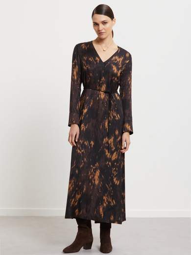 Abito midi in pura viscosa stampata con cintura e scollo a V.