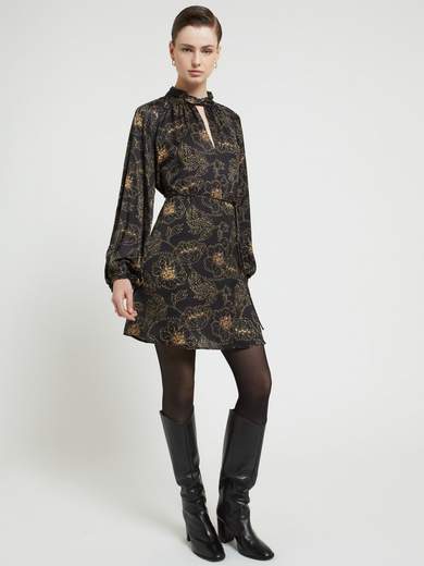 Abito corto in pura viscosa stampata con cintura in tinta e chiusura a goccia.