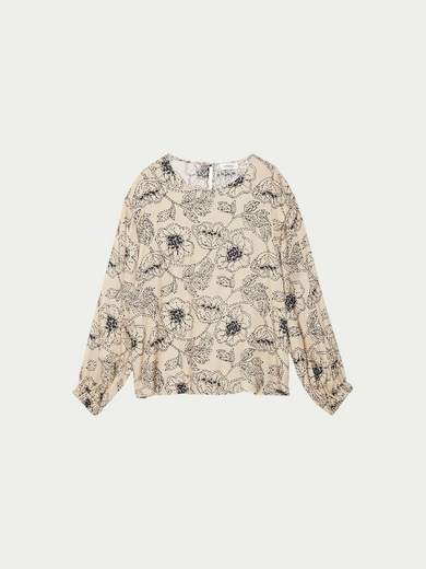 Blusa in pura viscosa stampata con chiusura a goccia e manica increspata.