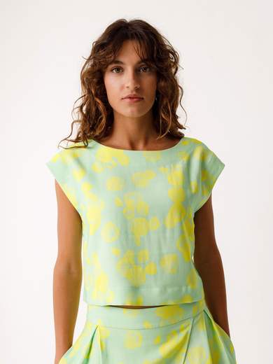 Camicetta dritta con scollo rotondo, spalle abbassate e maniche corte.