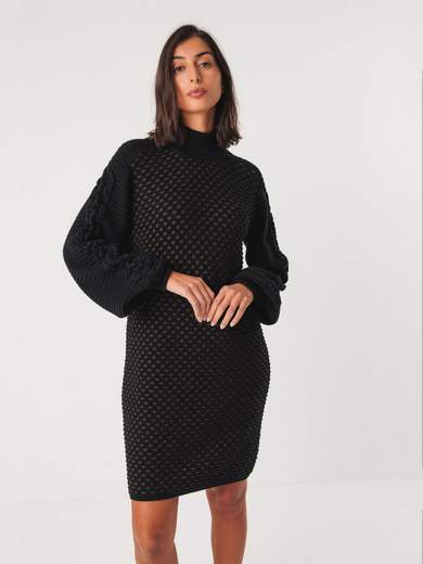 Abito dritto al ginocchio in maglia bicolore leggermente spessa. Effetto testurizzato. Scollo a V lungo e maniche lunghe a sbuffo in maglia a V.