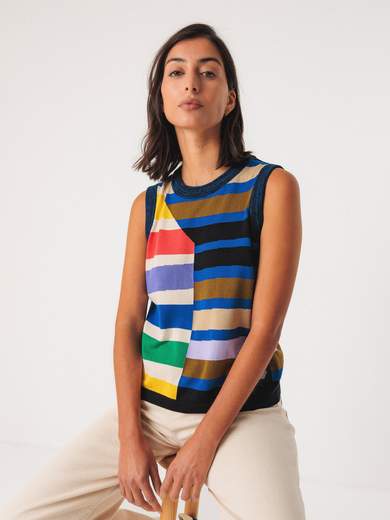 Gilet in maglia. Aderente e senza maniche. Scollo rotondo e stampa a quadri multicolore.